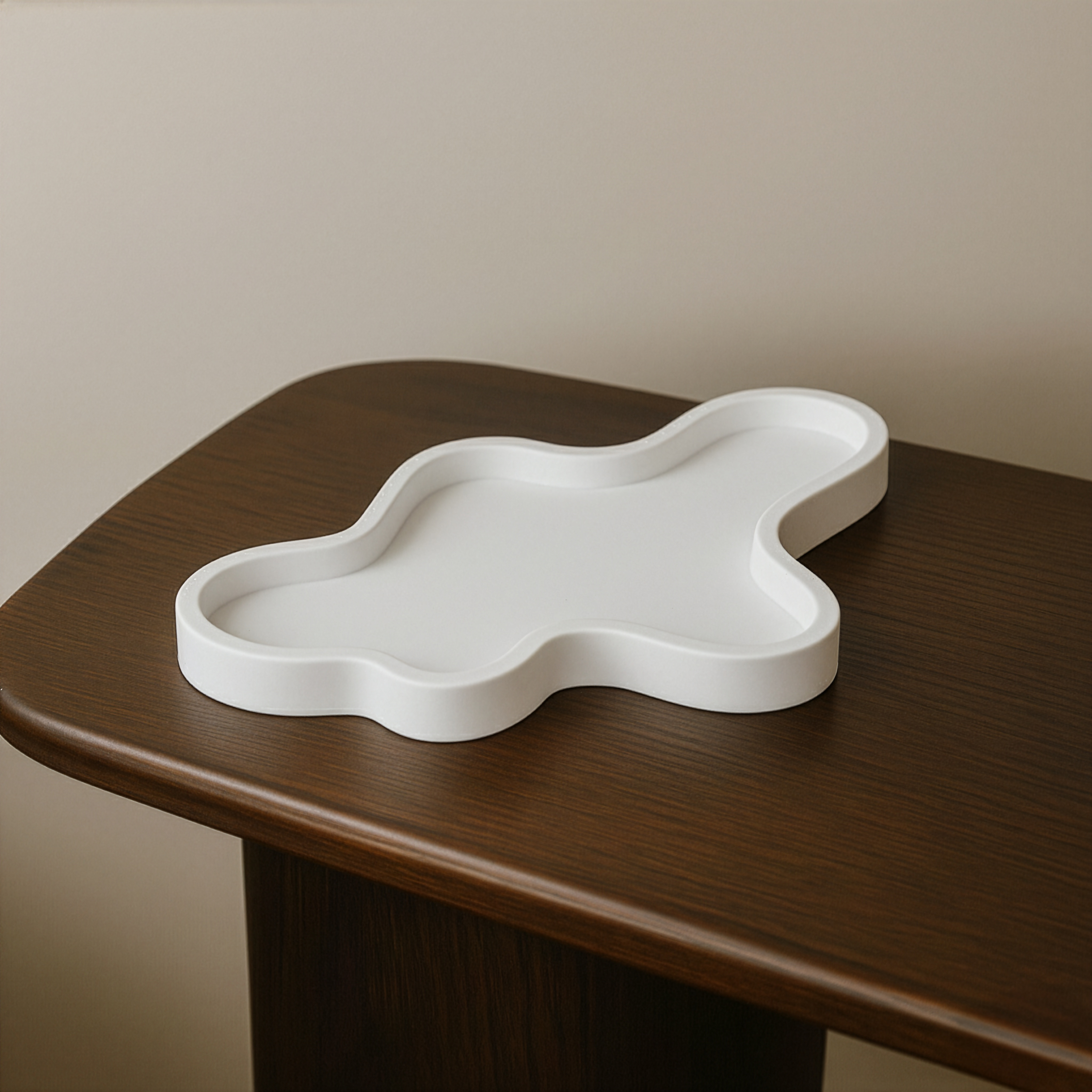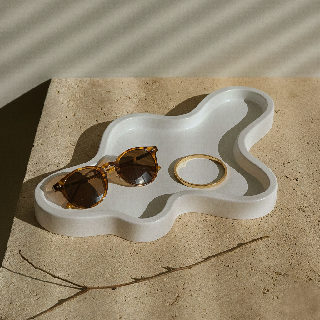 ruhig und reduziert. Die fliessende Form und die leicht seidig schimmernde Oberfläche aus Giesspulver machen dieses Tablett zum