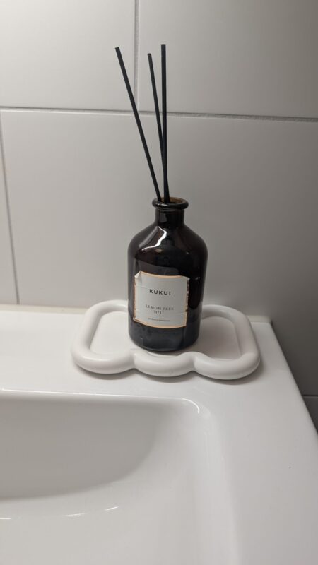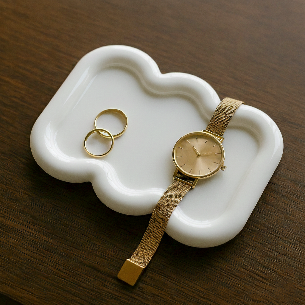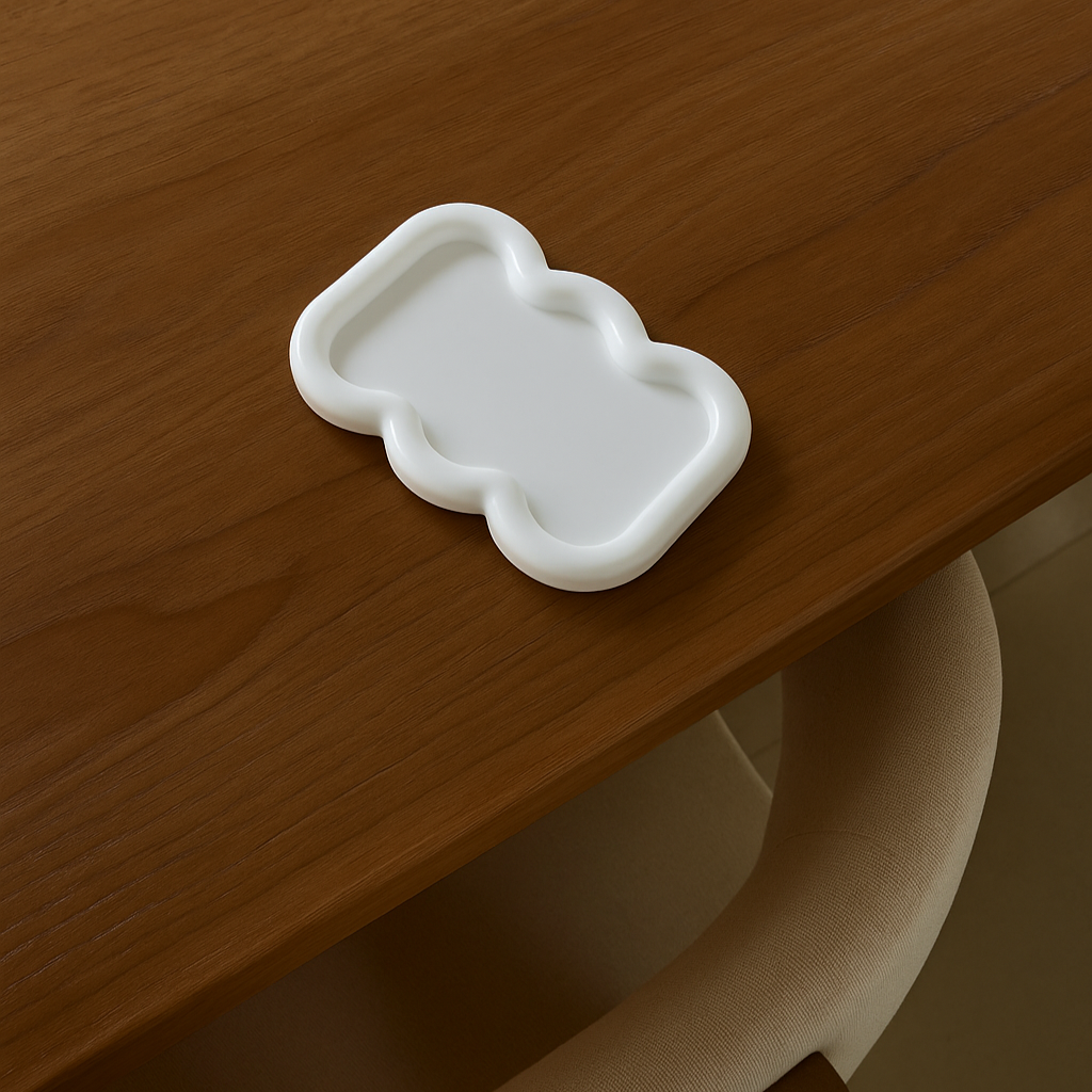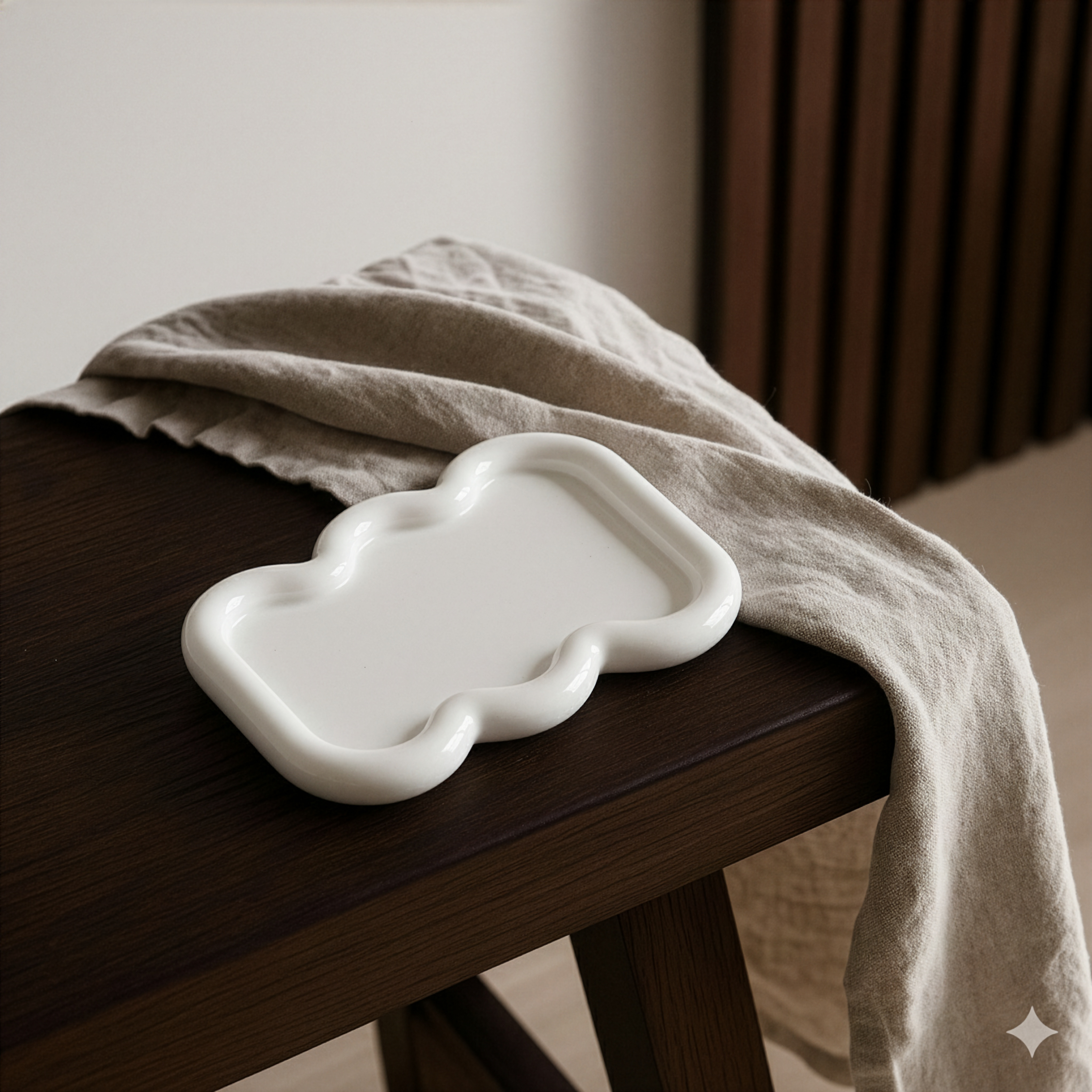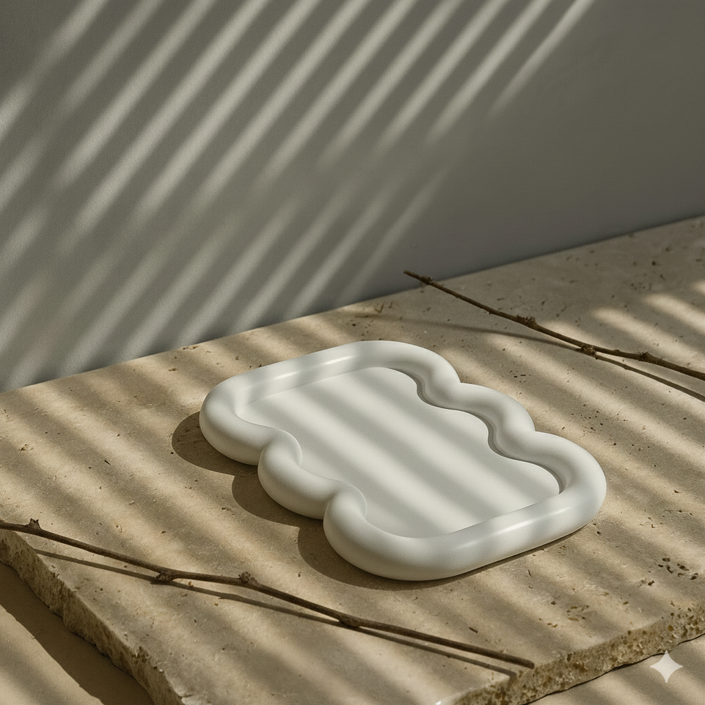 Die geschwungenen Linien verleihen dem Tablett eine verspielte Ruhe, während die leicht seidig schimmernde Oberfläche in zartem Naturweiss seine Zurückhaltung unterstreicht.